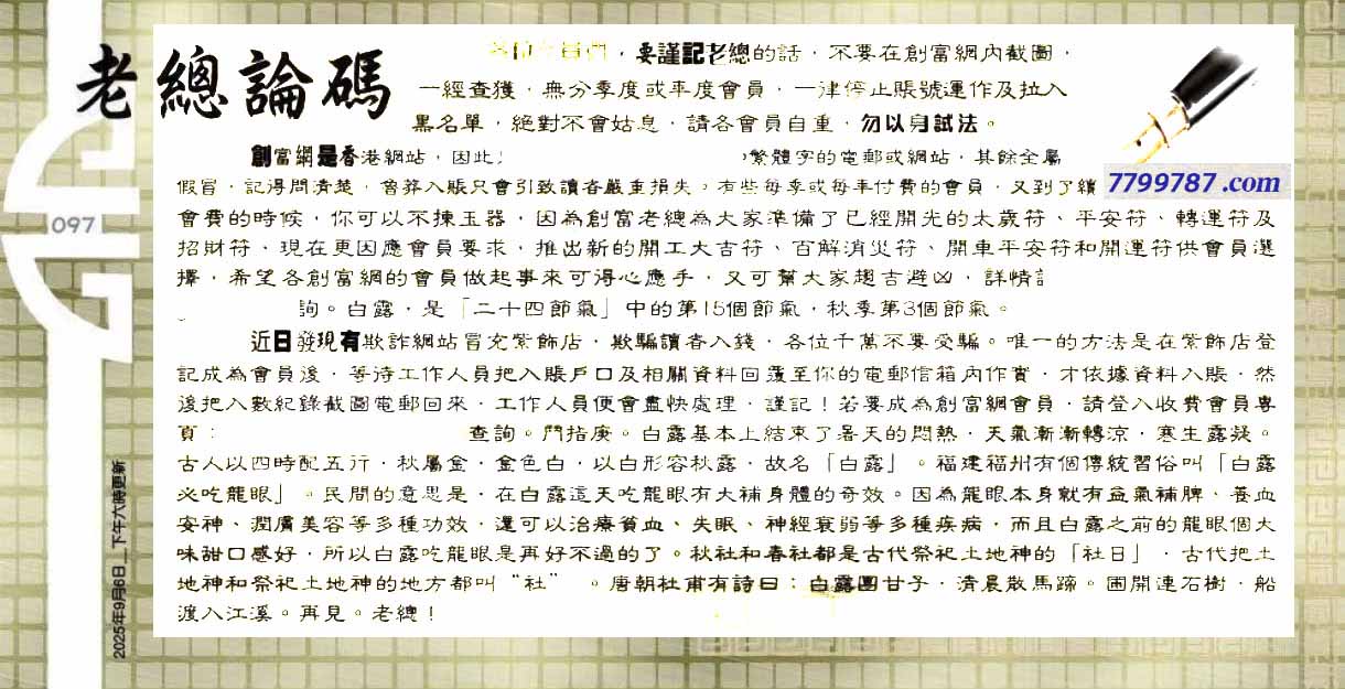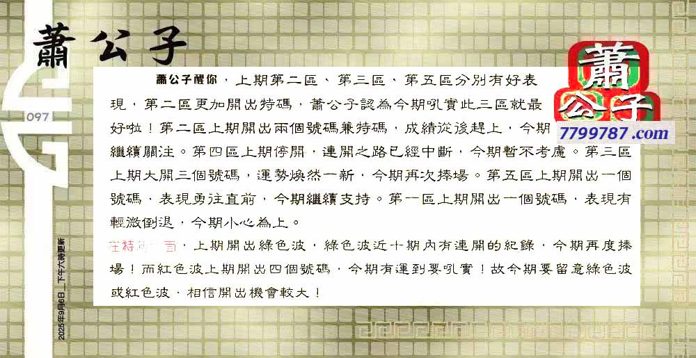 主题 :097期:六合皇金句/老总论码/萧公子/林大师/五行夺码/老总信箱截 |