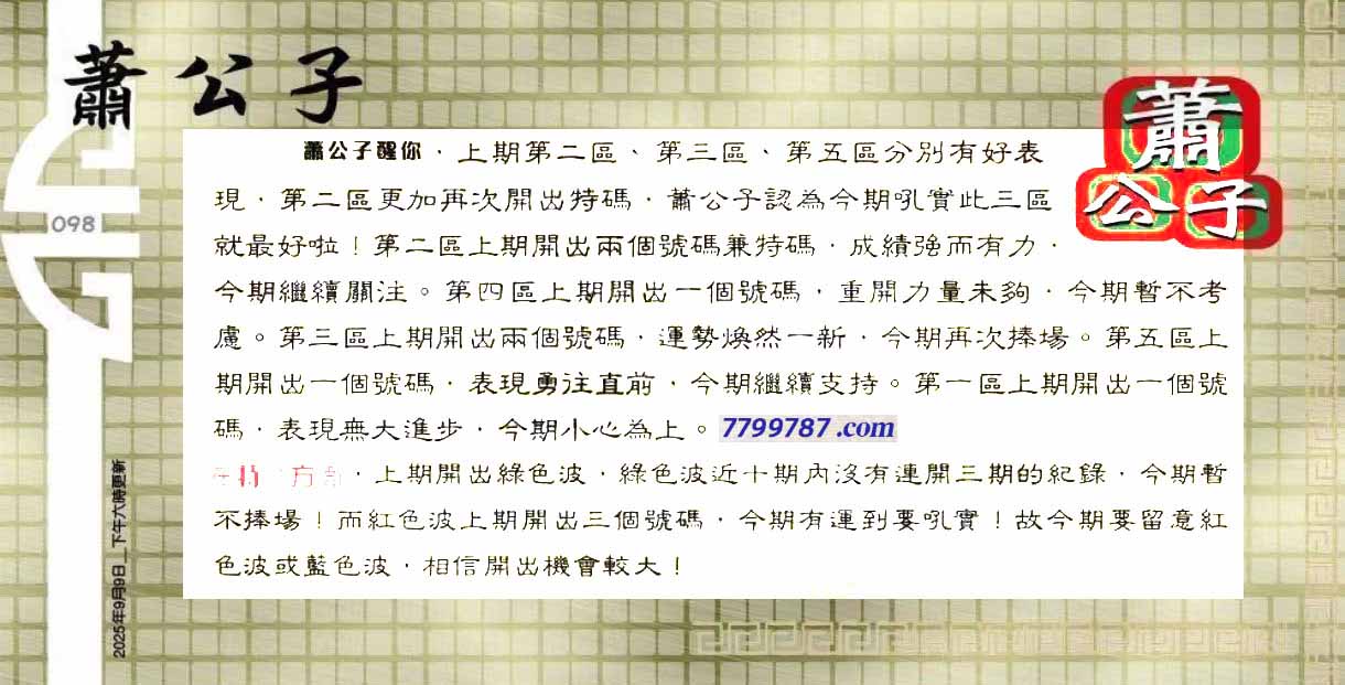 主题 :098期:六合皇金句/老总论码/萧公子/林大师/五行夺码/老总信箱截 |