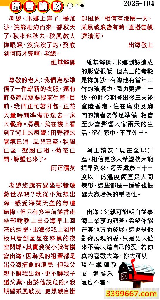 主题 :104期:彩民推荐〖貼信讀者論壇〗 |