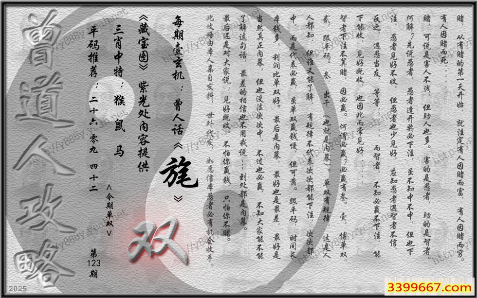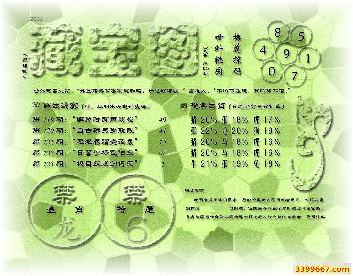 123期藏寶圖 新:得君海错俱奇绝 老:极目双峰剑倚天 禁:龙 禁:6尾 玄機字:《旄》