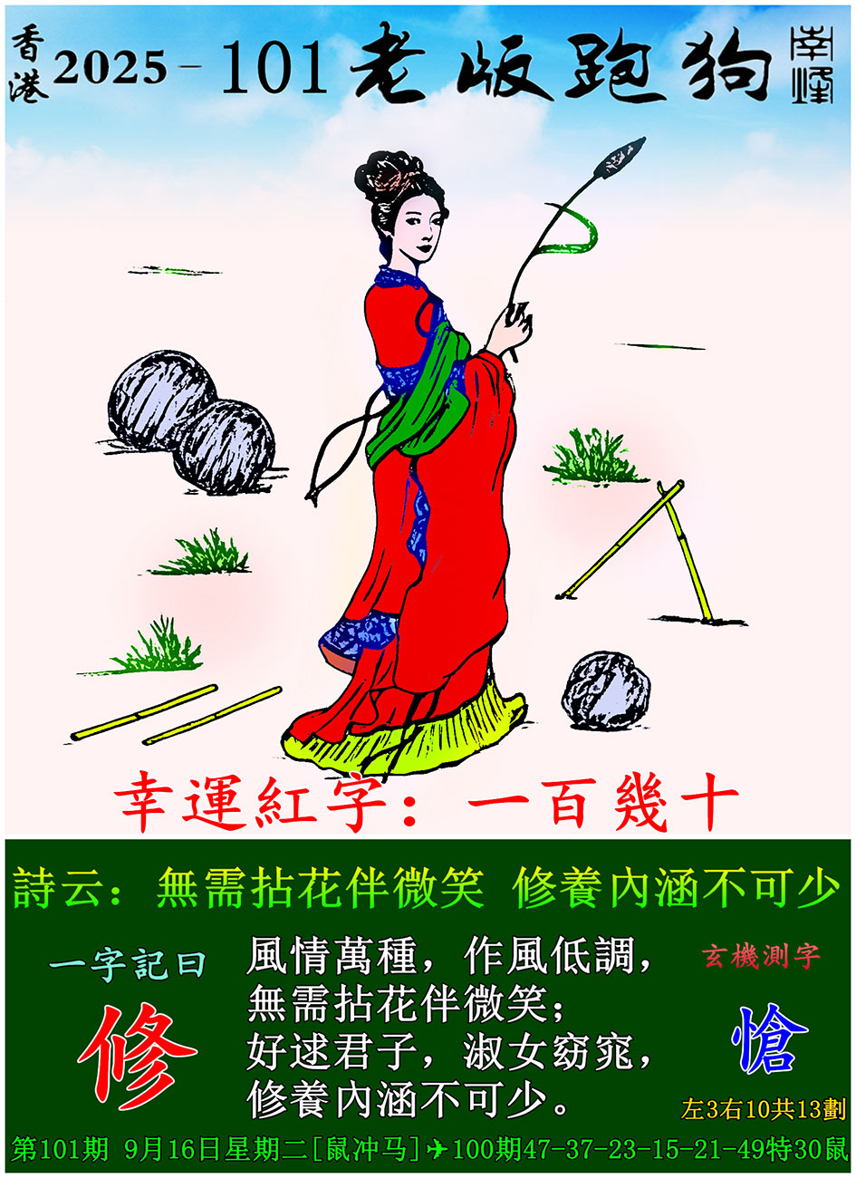 | 主题 :101期老版跑狗一字記之曰:【修】 玄機測字:《愴》 |